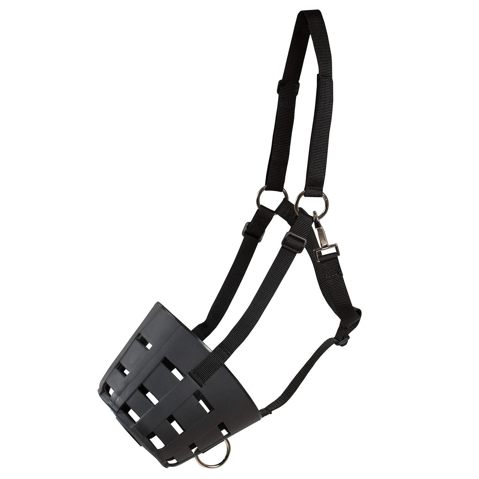 Legen Sie Pferden diese Fressbremse an, die möglicherweise ihr Grasen begrenzen müssen. Dies ist auch eine funktionelle Option für das Training von Pferden mit der Gewohnheit zu beißen. Mehrere kleine Stege verhindern Essen und Beißen, während sie einen einwandfreie Atmung zulassen. Die leicht zu reinigende Fressbremse ist langlebig und lässt sich leicht über einem Halfter befestigen. Das weiche Material verhindert Unbehagen auf der Haut.
