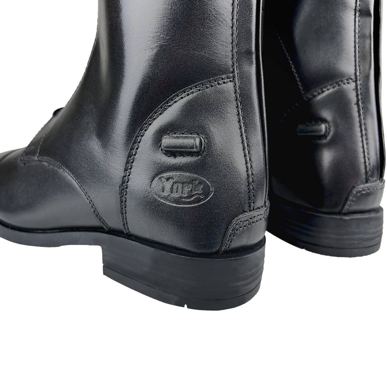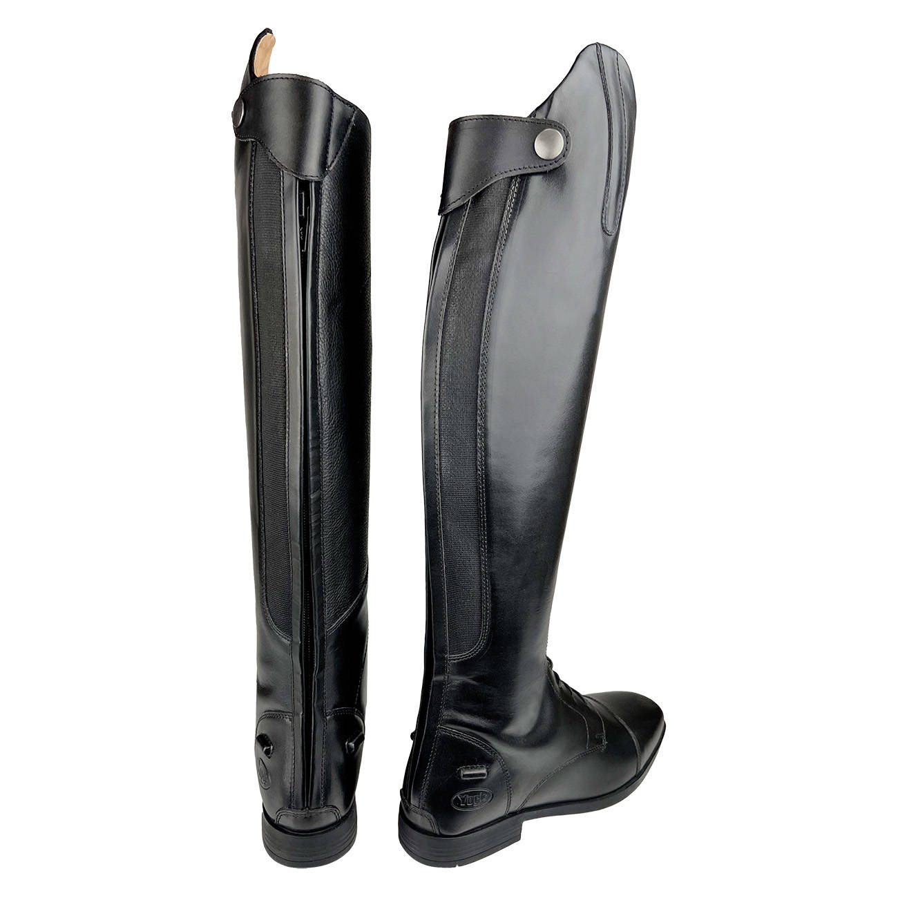 Klassischer Lederreitstiefel mit elastischer Schnürung vorne und einem Reißverschluss an der Hinterseite des Stiefels, der durch einen Druckknopf gesichert wird. Der Reitstiefel hat eine sehr schlanke Optik und elastische Einsätze für eine optimale Passform. Der Schaft ist Standard.