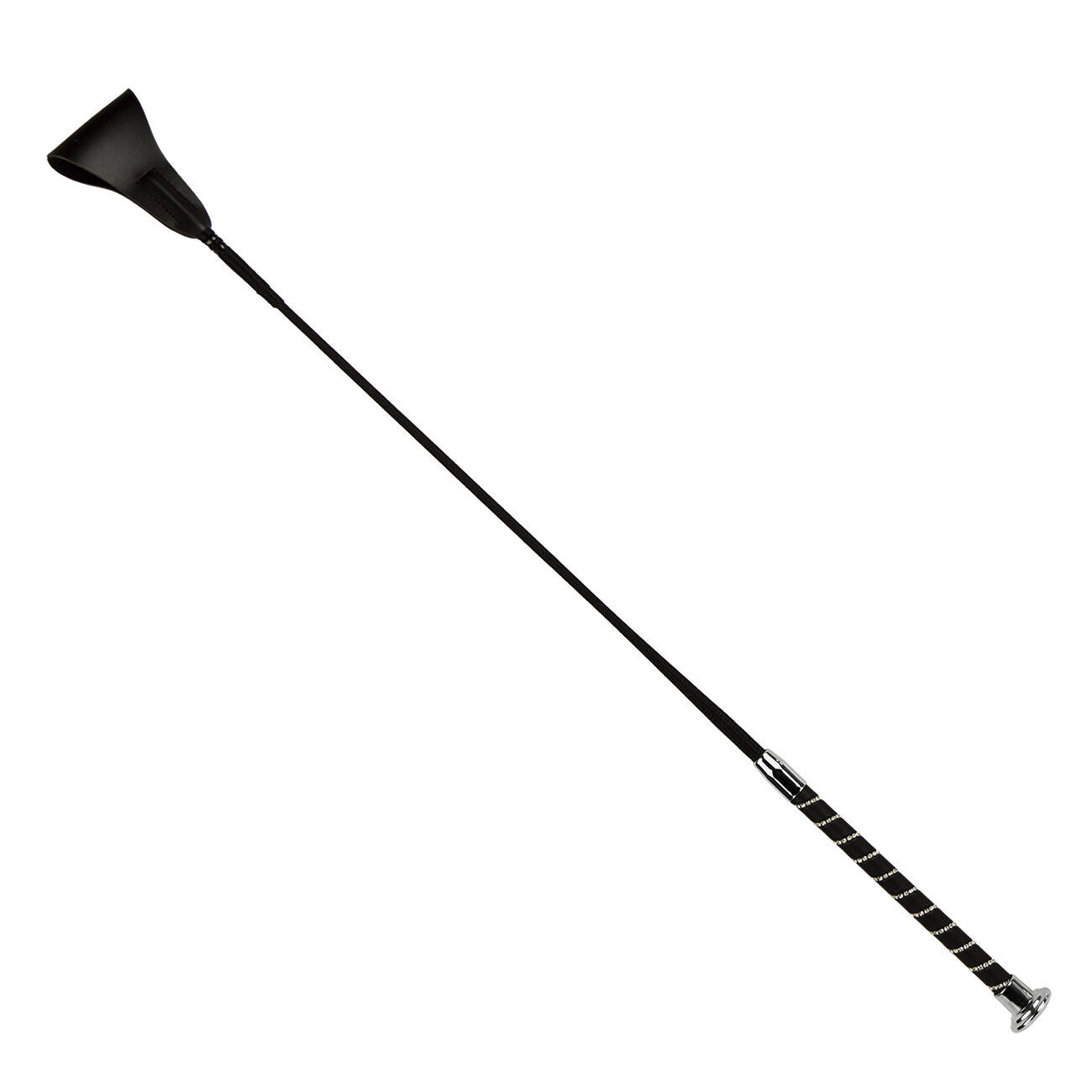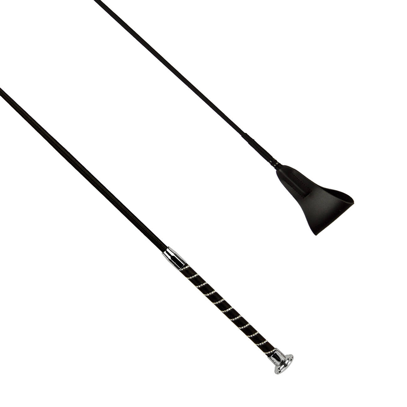 Edles, mattes Schwarz in Verbindung mit metallischen Beschlägen ist die Quintessenz des Stils. Der Zusatz von Strass sorgt dafür, dass die Gerte stabil und sicher in der Hand liegt.