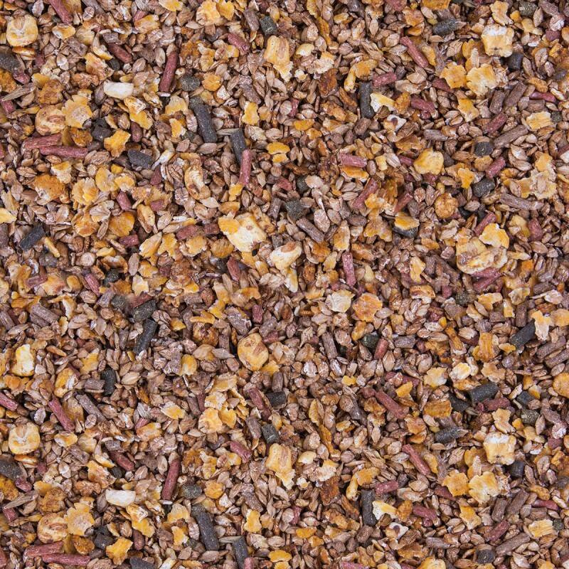 Skład: płatki kukurydziane, ekspandowane płatki jęczmienne, ekspandowane płatki pszenne, susz z lucerny, otręby pszenne, ekspandowana kukurydza, melasa, jęczmień, drożdże piwne, węglan wapnia, węglan sodu, fosforan jednowapniowy, olej lniany