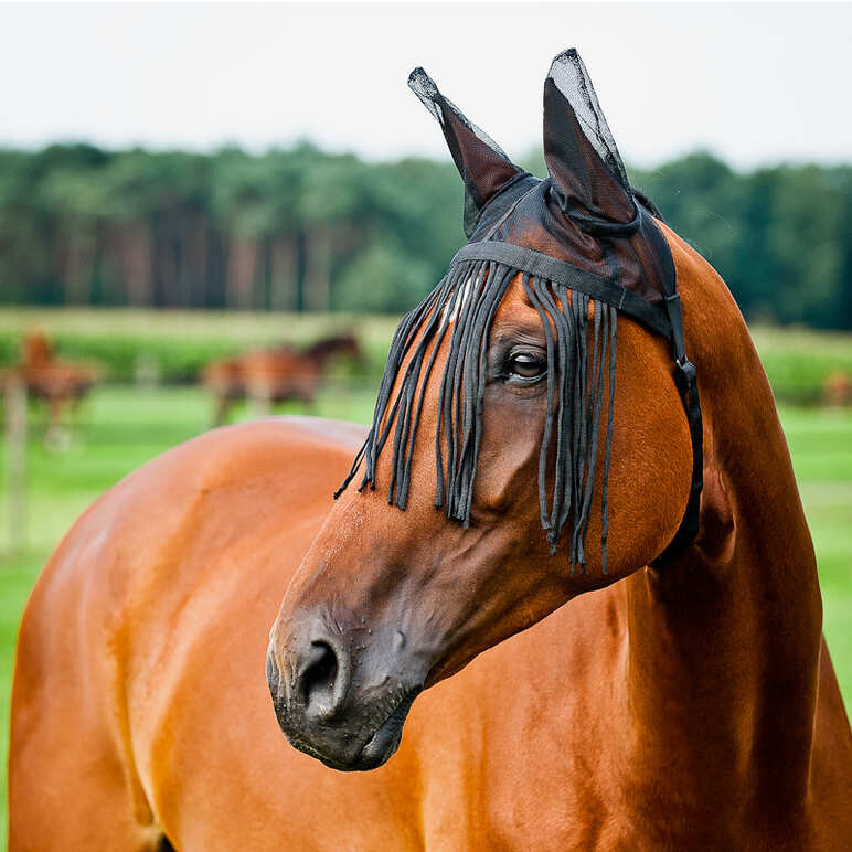 Przedłuż grzywkę swojego konia za pomocą frędzli zabezpieczających przed owadami. Łatwe w zakładaniu nauszniki zapewniają przepływ powietrza i swobodę bez potrzeby zakładania maski zakrywającej całą głowę na czas pobytu konia na pastwisku.