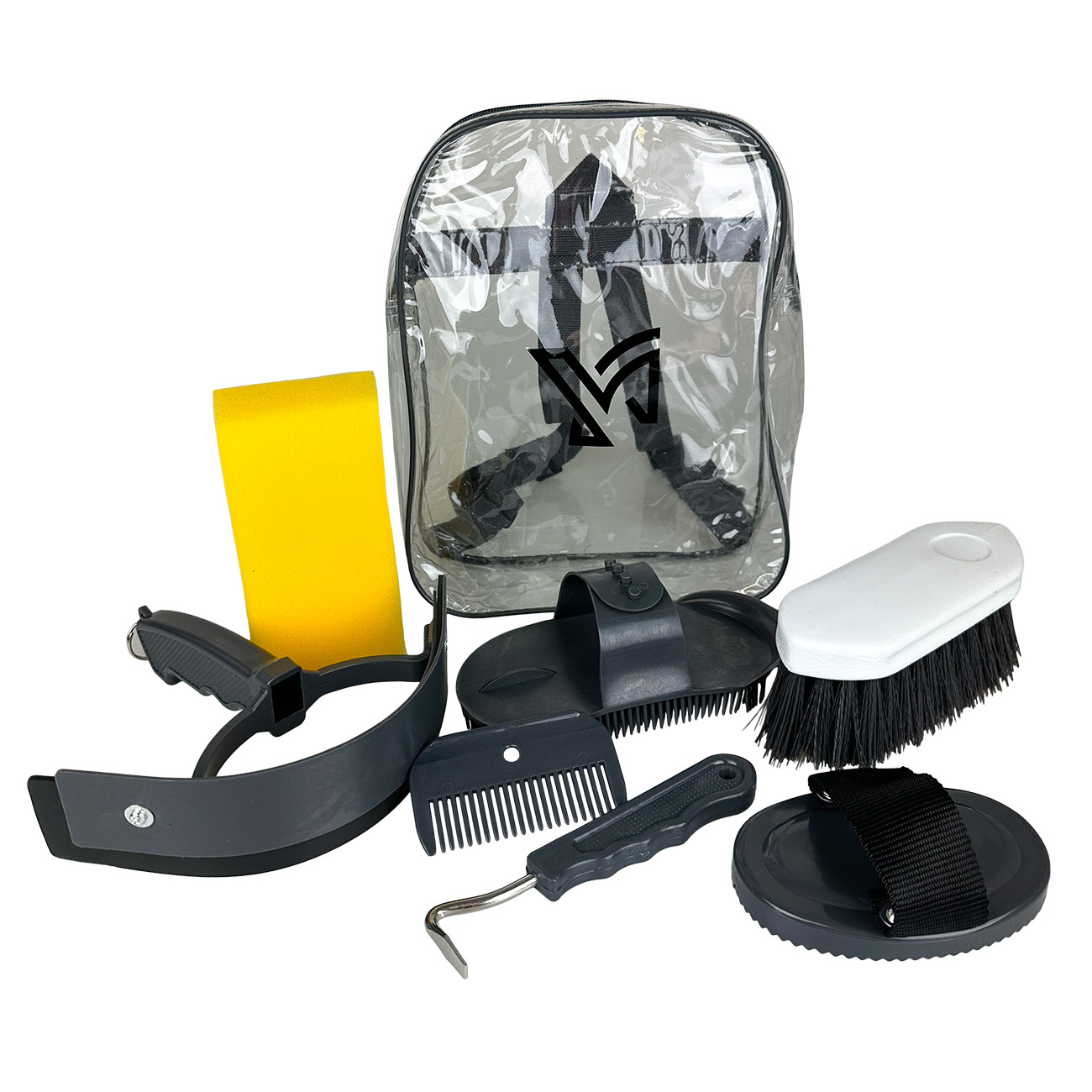 Akcesoria do czyszczenia konia zapakowane w transparentny plecak.