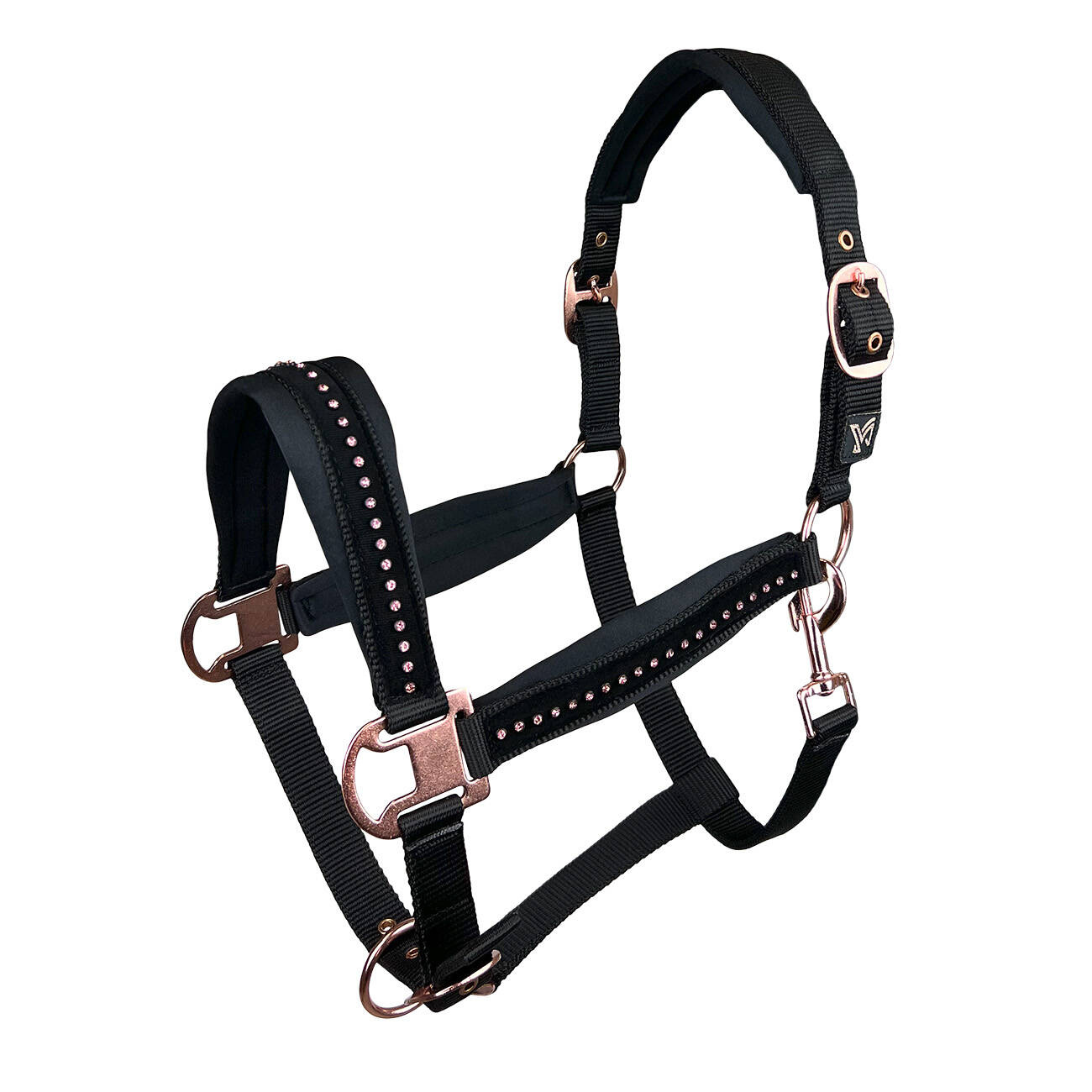 Zachwyci każdego wykonaniem w stylu glamour z okuciami w kolorze różowego złota. Posiada miękkie w dotyku podszycie przy potylicy, nachrapniku i paskach policzkowych. Dodatkowe zdobienie w postaci połyskujących kryształków daje olśniewający efekt.