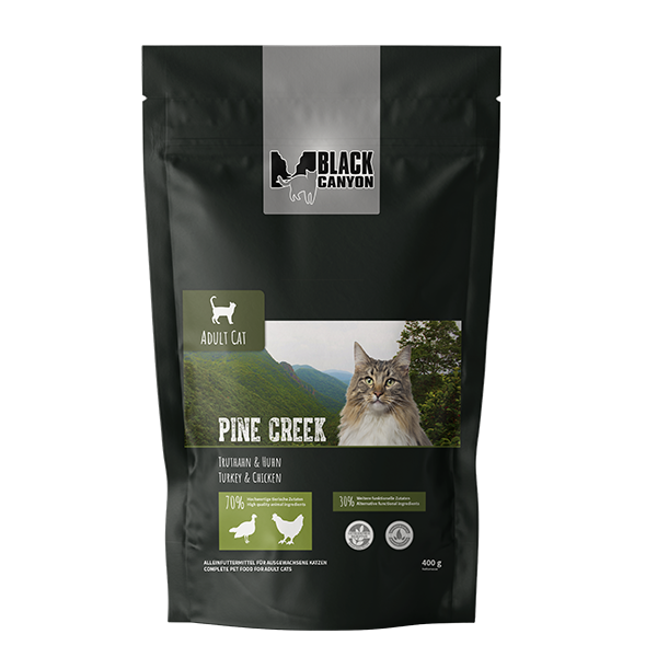 Sucha karma Black Canyon Pine Creek – Indyk i Kurczak składa się w 70% z wysokiej jakości składników pochodzenia zwierzęcego, a także zawiera wszelkie składniki odżywcze, jakie kot potrzebuje dla prawidłowego funkcjonowania i zdrowego rozwoju.