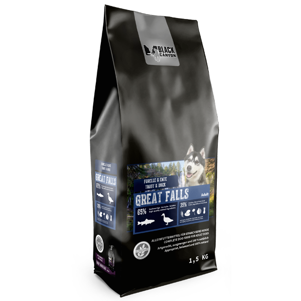 Sucha karma Black Canyon Great Falls składa się w 65% z wysokiej jakości składników pochodzenia zwierzęcego. Oznacza to, że 2/3 tego, co codziennie wkładasz do miski swojego psa, to najlepsze mięso z kaczki, pstrąga i tłuszcze zwierzęce, czyli dokładnie to, czego potrzebuje pies, który z natury jest mięsożercą.