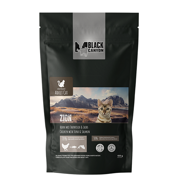 Sucha karma Black Canyon Zion kurczak z tuńczykiem i łososiem została stworzona z myślą o: kotach sterylizowanych/kastrowanych, starszych i/lub ze skłonnością do otyłości. Świeże, chude mięso z kurczaka, wraz ze świeżym tuńczykiem i łososiem są ważnymi elementami budulcowymi mięśni i optymalnej kondycji. Obniżona zawartość tłuszczu pomaga kotu utrzymać odpowiednią wagę, a wysoka zawartość białka wspiera rozwój zdrowych mięśni. Tuńczyk i łosoś są doskonałym źródłem niezbędnych kwasów tłuszczowych Omega-3, które mają właściwości przeciwzapalne i wspierają zdrowie skóry, sierści i stawów. Całość dopełniają wartościowe dodatki, w tym: