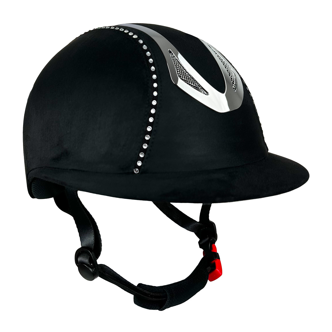 Kask został pokryty z zewnątrz eleganckim, welurowym materiałem z dodatkiem kryształków. Estetycznie wkomponowane otwory wentylacyjne, zapewnią komfort w cieplejsze dni.