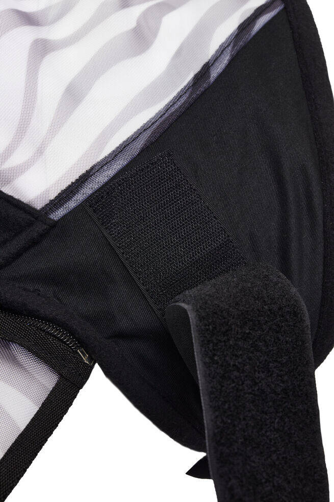 Spraw, aby Twój koń był zadowolony na pastwisku dzięki masce ze wzorem zebry. Udowodniono, że owady są zdezorientowane i trzymają się z dala od przedmiotów ze wzorem zebry. Odpinana część na nos pozwala dostosować maskę do własnych potrzeb. Materiał na uszach i górnych partiach głowy wykonano z siatki, aby zapewnić przepływ powietrza. Miękkie, polarowe podszycie wokół uszu i oczu zapobiega otarciom i utracie włosów. Zapięcia na rzep umożliwiają łatwe zakładanie maski.
