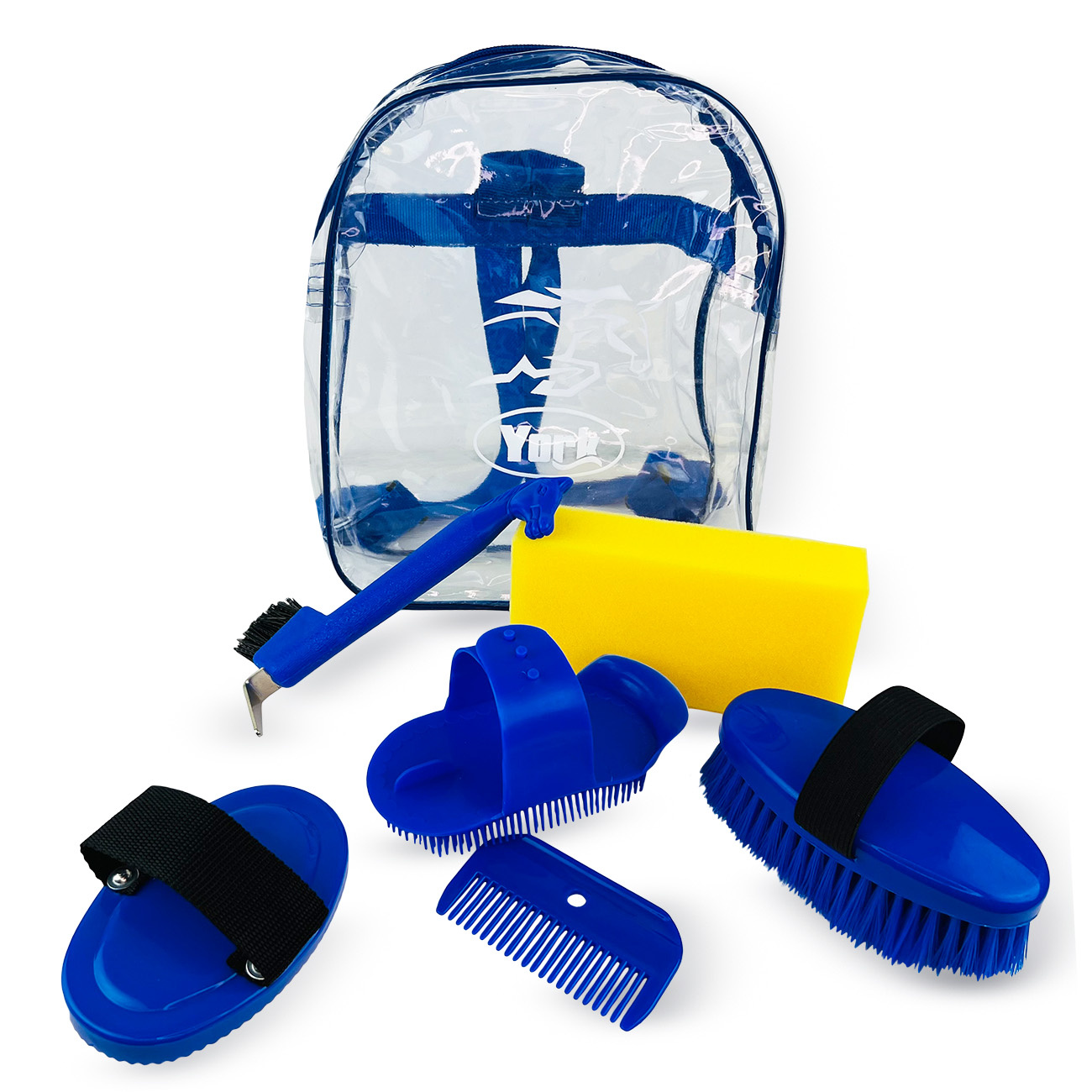 Akcesoria do czyszczenia konia zapakowane w transparentny plecak.