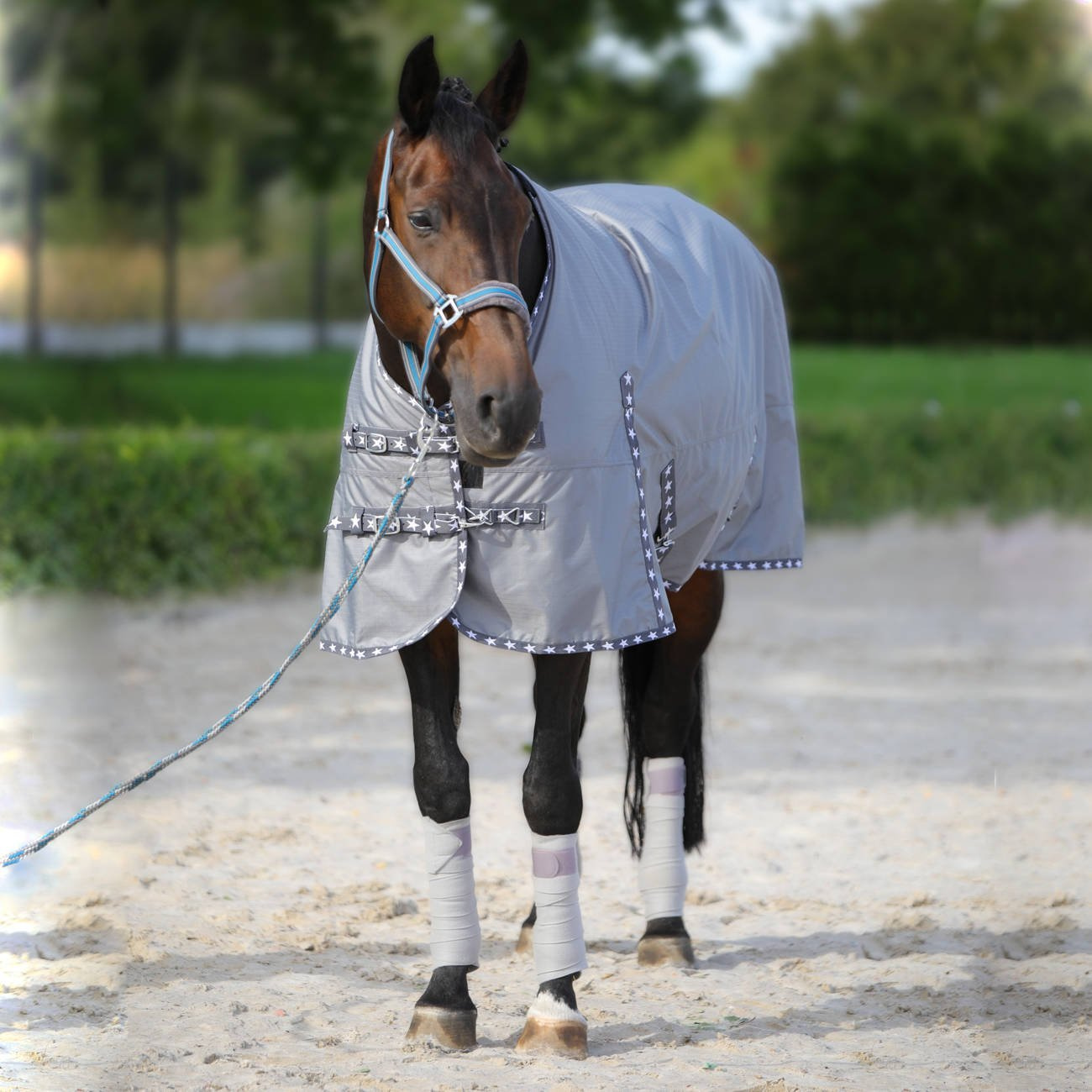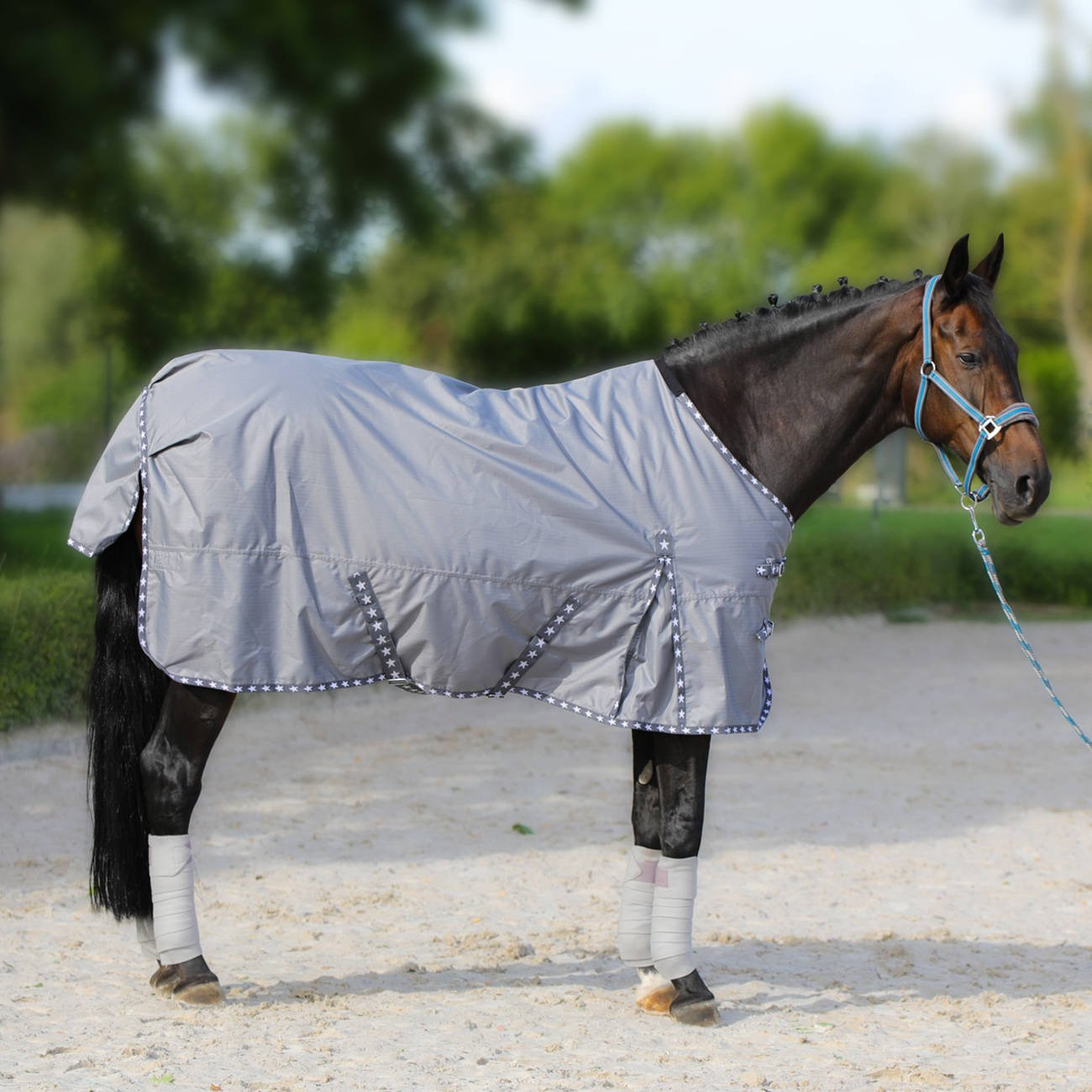 Oryginalna, delikatnie ocieplana derka przeciwdeszczowa, obszyta lamówką w gwiazdki.