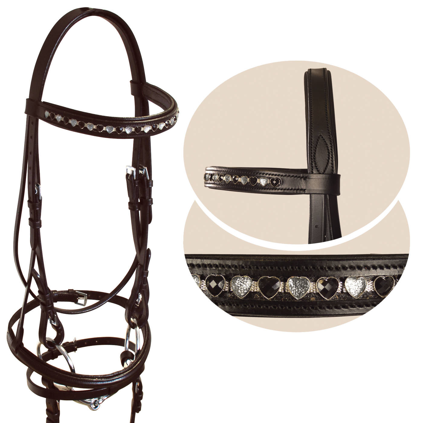 • model skórzanej tranzelki, której naczółek ozdobiony został kryształkami w kształcie serduszek