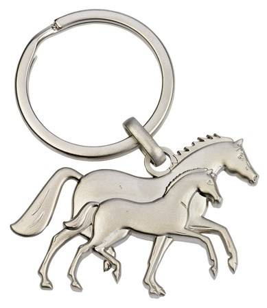 trójwymiarowy breloczek w srebrnym kolorze z zawieszką w kształcie klaczy i źrebięcia